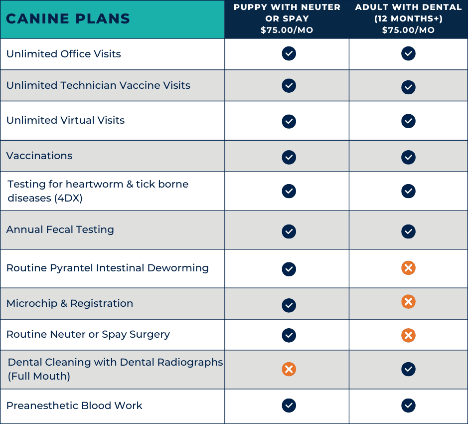 The Adult with Dental Care plan is built for dogs over one year old. This plan includes a dental cleaning and dental radiographs as well as annual blood work (major organ and blood cell screening) and testing for heartworm and tick borne diseases (4DX).