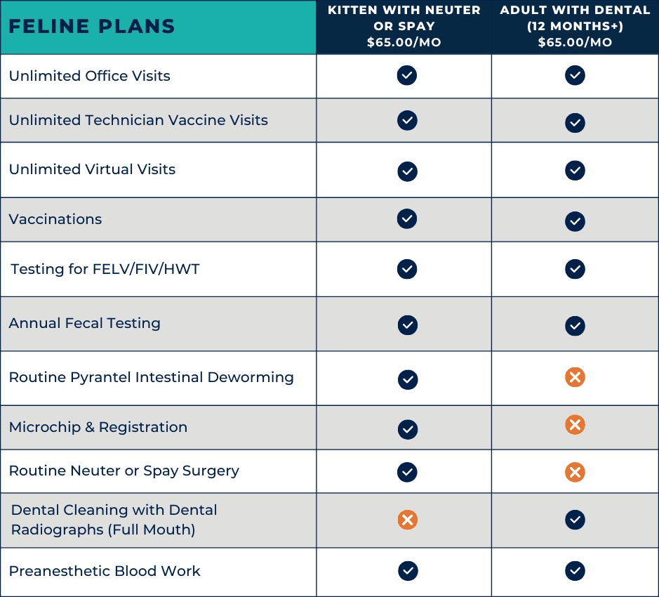 The Adult with Dental Care plan is built for cats over one year old. This plan includes a dental cleaning and dental radiographs as well as annual blood work (major organ and blood cell screening) and testing for FELV/FIV/HWT.
